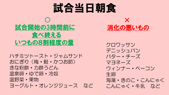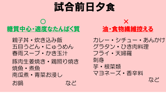 また試合前は運動量が減っているので食事のエネルギー量も調整しましょう。緊張から消化吸収力も落ちている場合があるので食べ慣れているものを選びましょう。